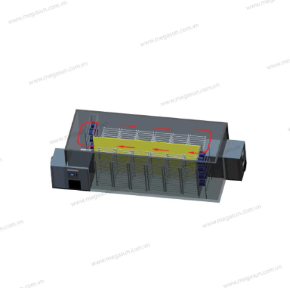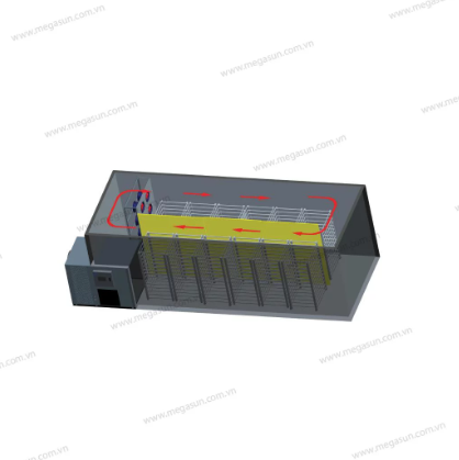 Dòng khí nóng trong thùng sấy lưu chuyển theo phương ngang giúp nhiệt độ phân bổ đều