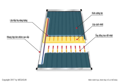 Tấm phẳng hấp thu nhiệt đóng vai trò hấp thu năng lượng mặt trời và chuyển đổi quang năng thành nhiệt năng để tải nhiệt vào trong nước. Tấm phẳng Megasun chịu được áp suất cao, chống bể vỡ, chống đông và chống rỉ sét theo tiêu chuẩn Châu Âu.