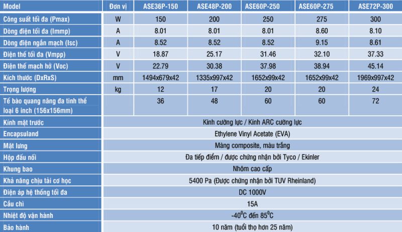 Tiêu chuẩn áp dụng trong sản xuất: ISO 9001, ISO 14000, ISO 18001, IEC 61215, IEC 61730-1, IEC 61730-2, IEC 61701, IEC 61716, IEC 62804