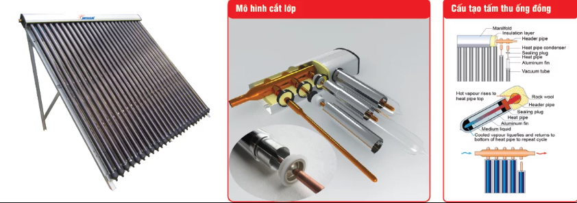 + Loại ống thu nhiệt: ống chân không lõi đồng - Thu nhiệt cực nhanh, chịu được áp suất làm việc cao - ống thu nhiệt không bị đóng cặn - hiệu suất thu nhiệt cao .
